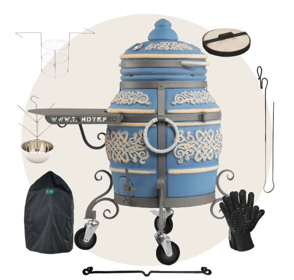 тандыр, шампуры, кочерга, совок, колосник, приспособление для подвешивания шампуров, термометр, жароотсекатель, столик, колёса - 4 шт., чехол на тандыр, этажерка 3-х ярусная средняя, ёлочка 21 см с высоким бортом, шампур двойной, перекладина, перчатки