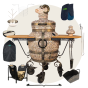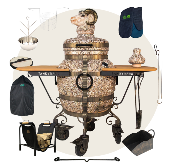 тандыр, шампуры, кочерга, совок, колосник, крестовина, термометр, жароотсекатель, столик - 2 шт., колёса - 4 шт., дополнительный колпачок, чехол на тандыр, рукавицы-прихватки, зольный ящик, сумка-переноска-дровница, этажерка 3-х ярусная большая и т.д.