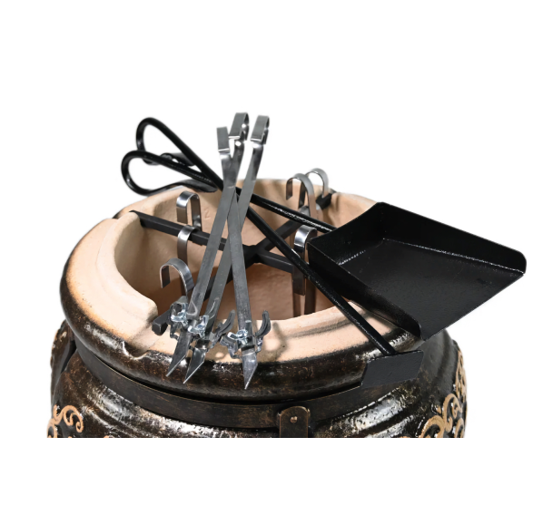 тандыр, шампуры, кочерга, совок, колосник, приспособление для подвешивания шампуров, термометр, чехол на тандыр
