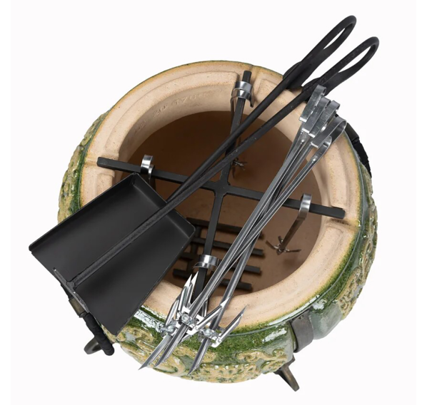 тандыр, шампуры, кочерга, совок, колосник, приспособление для подвешивания шампуров, термометр, чехол на тандыр