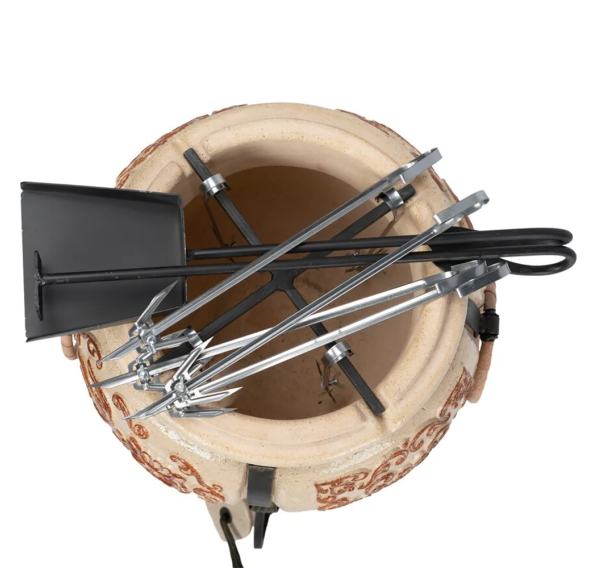 тандыр, шампуры, кочерга, совок, колосник, приспособление для подвешивания шампуров, термометр, чехол на тандыр