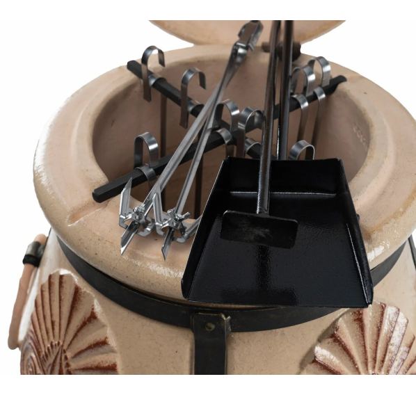 тандыр, шампуры, кочерга, совок, колосник, приспособление для подвешивания шампуров, термометр, жароотсекатель, чехол на тандыр, колёса - 4 шт.