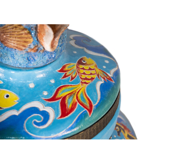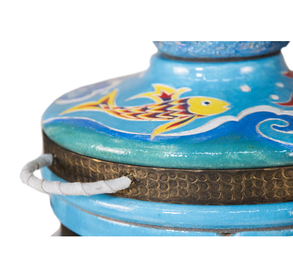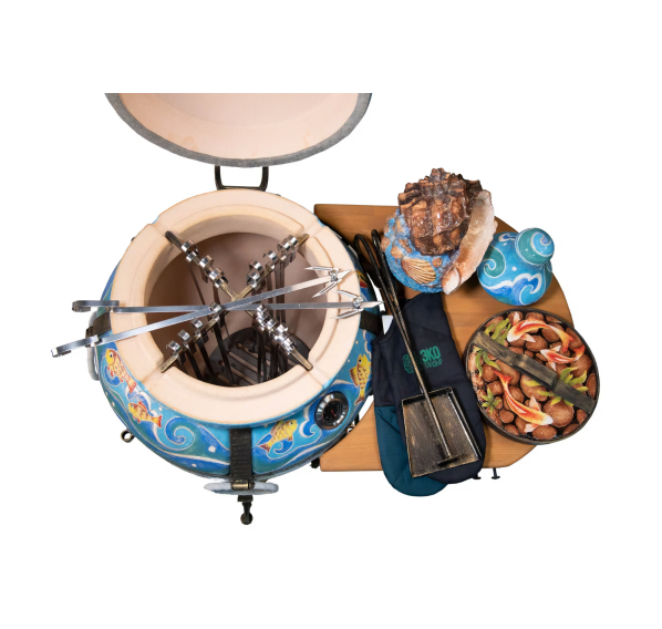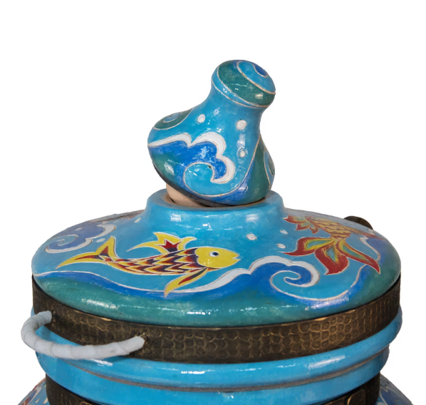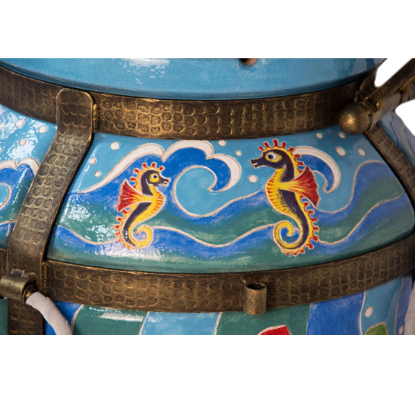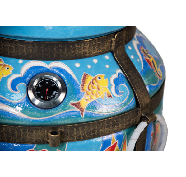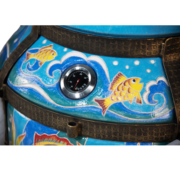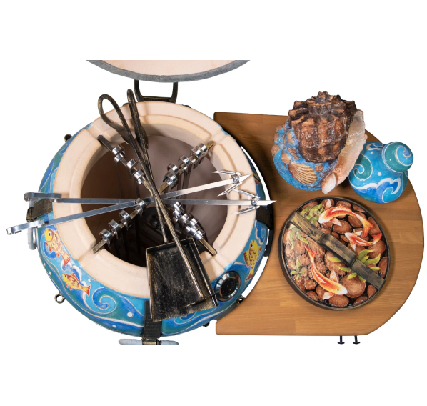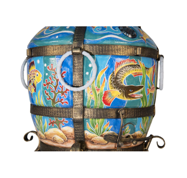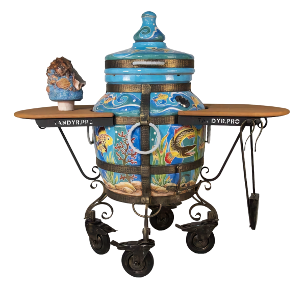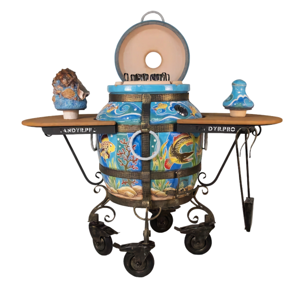 Эксклюзивный тандыр "ЭКОтандыр-Морской" представляет линейку эксклюзивных тандыров. Покрытие на нём выполнено профессиональными художниками-керамистами по технологии майолика. В спокойные сине-голубые оттенки, которыми нарисованы стилизованные волны, врываются золотисто-оранжевые рыбки — словно намёк на то, что все желания гурманов будут исполнены. Стенки толщиной 8 см отлично держат жар. За 15 минут в эксклюзивном тандыре "ЭКОтандыр-Морской" приготовятся волшебно-вкусные мясо и птица — зажаристые, с румяной розоватой корочкой. А ароматные запечённые овощи на гарнир сохранят все витамины и останутся сочными и аппетитными. Все эти блюда не просто украсят Ваш стол — они станут песней Вашего кулинарного искусства! Эксклюзивный тандыр "ЭКОтандыр-Морской" — прекрасный подарок для тех, кто следит за здоровьем и предпочитает полезную пищу. Подарите тандыр — исполните желание своих близких!