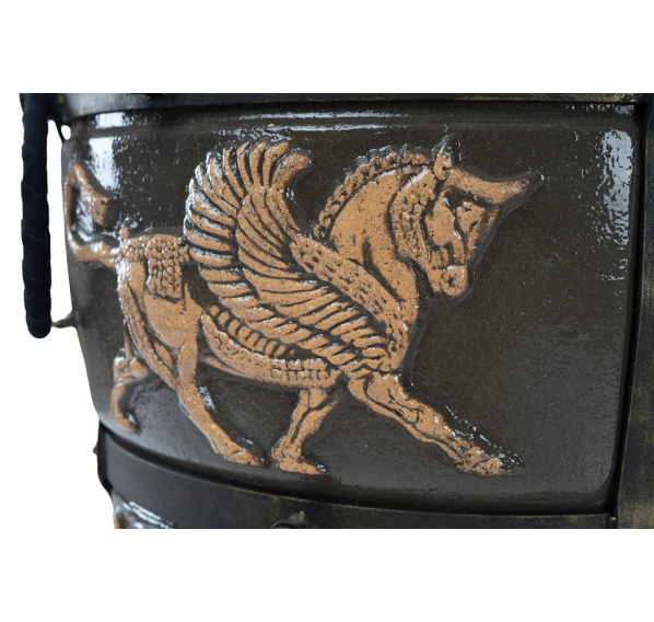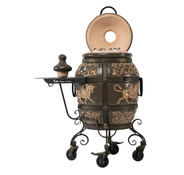 Тандыр "ЭКОтандыр-Перс-Толпар" — для требовательных, но оригинальных гурманов. Большой размер и широкая горловина сочетается с изысканной формовкой от большего к малому: в корпус тандыра помещается от двух до более закладок различных блюд, а термометр, удобно размещённый на корпусе, оперативно измерит прогрев толстых стенок. Тандыр пронизан отголосками к тюркской культуре — на его корпусе красуется глянцевый Толпар (в переводе означает "Крылатый конь"), что является его изюминкой и оригинальной чертой. Опорой тандыру служат устойчивые кованые ножки. Тандыр "ЭКОтандыр-Перс-Толпар" впишется в любой загородный дом, дачу или коттедж, согревая и обеспечивая комфорт в использовании.
