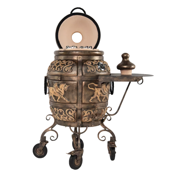 Тандыр "ЭКОтандыр-Перс-Толпар" — для требовательных, но оригинальных гурманов. Большой размер и широкая горловина сочетается с изысканной формовкой от большего к малому: в корпус тандыра помещается от двух до более закладок различных блюд, а термометр, удобно размещённый на корпусе, оперативно измерит прогрев толстых стенок. Тандыр пронизан отголосками к тюркской культуре — на его корпусе красуется глянцевый Толпар (в переводе означает "Крылатый конь"), что является его изюминкой и оригинальной чертой. Опорой тандыру служат устойчивые кованые ножки. Тандыр "ЭКОтандыр-Перс-Толпар" впишется в любой загородный дом, дачу или коттедж, согревая и обеспечивая комфорт в использовании.