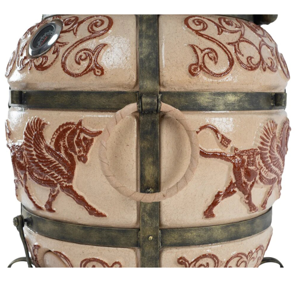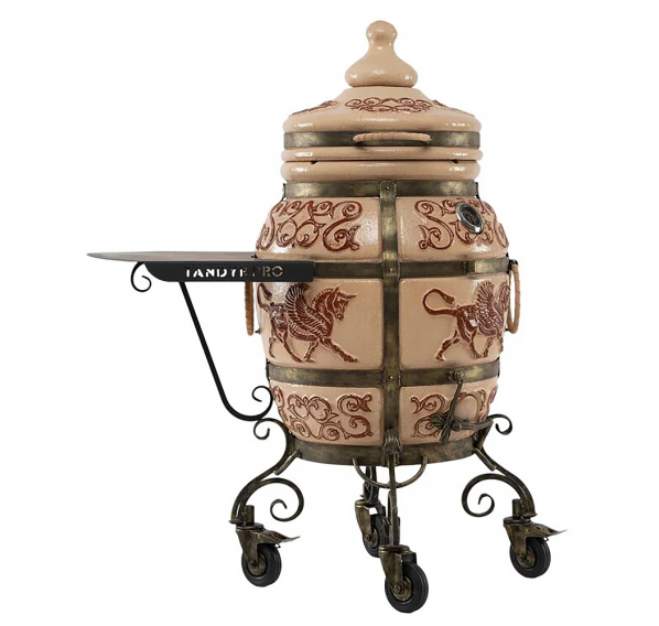 Тандыр "ЭКОтандыр-Перс-Толпар" — для требовательных, но оригинальных гурманов. Большой размер и широкая горловина сочетается с изысканной формовкой от большего к малому: в корпус тандыра помещается от двух до более закладок различных блюд, а термометр, удобно размещённый на корпусе, оперативно измерит прогрев толстых стенок. Тандыр пронизан отголосками к тюркской культуре — на его корпусе красуется глянцевый Толпар (в переводе означает "Крылатый конь"), что является его изюминкой и оригинальной чертой. Опорой тандыру служат устойчивые кованые ножки. Тандыр "ЭКОтандыр-Перс-Толпар" впишется в любой загородный дом, дачу или коттедж, согревая и обеспечивая комфорт в использовании.