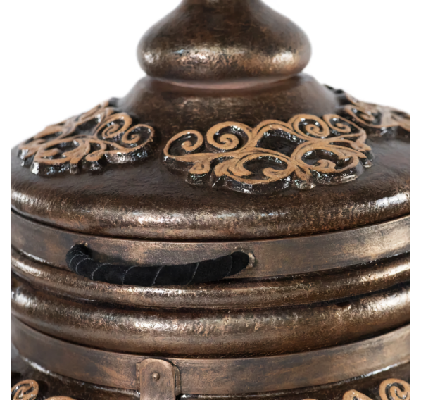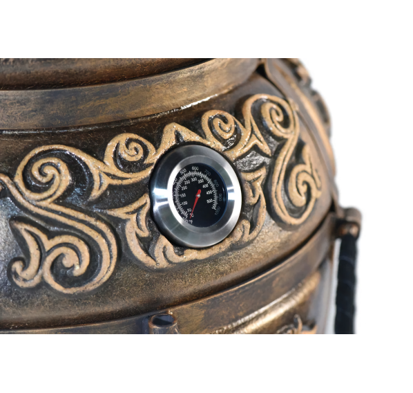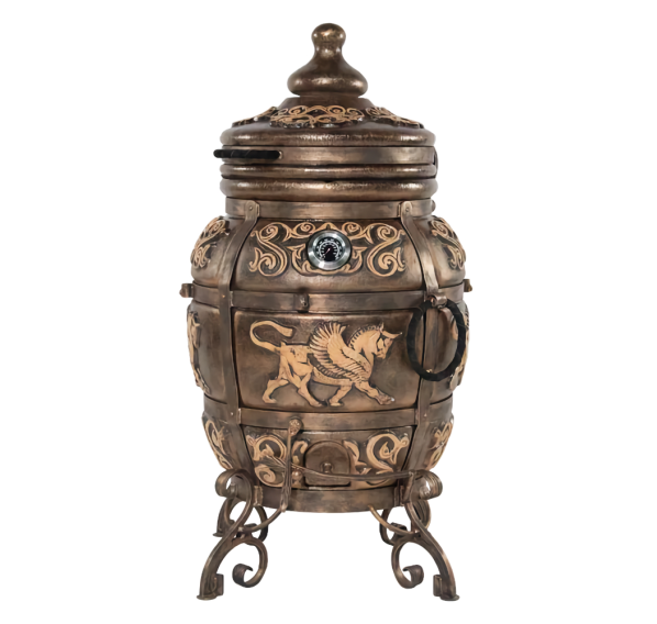 Тандыр "ЭКОтандыр-Перс-Толпар" — для требовательных, но оригинальных гурманов. Большой размер и широкая горловина сочетается с изысканной формовкой от большего к малому: в корпус тандыра помещается от двух до более закладок различных блюд, а термометр, удобно размещённый на корпусе, оперативно измерит прогрев толстых стенок. Тандыр пронизан отголосками к тюркской культуре — на его корпусе красуется глянцевый Толпар (в переводе означает "Крылатый конь"), что является его изюминкой и оригинальной чертой. Опорой тандыру служат устойчивые кованые ножки. Тандыр "ЭКОтандыр-Перс-Толпар" впишется в любой загородный дом, дачу или коттедж, согревая и обеспечивая комфорт в использовании.