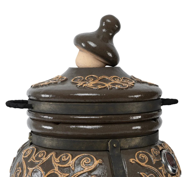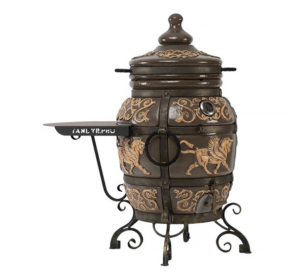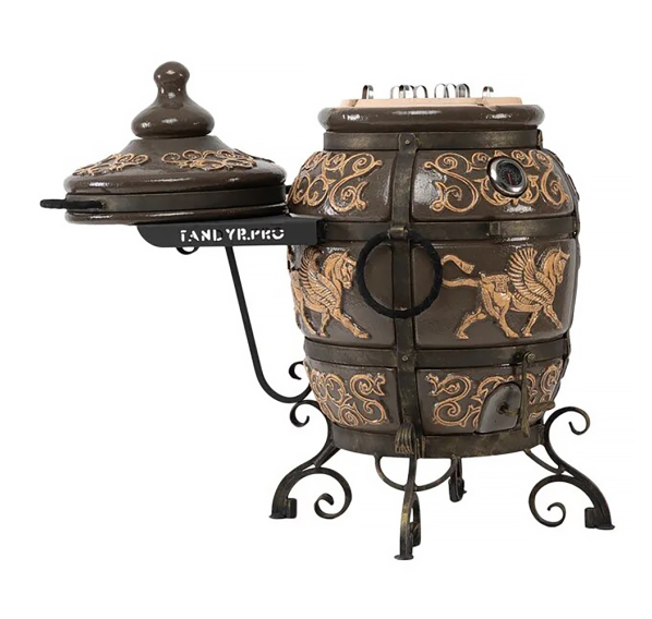 Тандыр "ЭКОтандыр-Перс-Толпар" — для требовательных, но оригинальных гурманов. Большой размер и широкая горловина сочетается с изысканной формовкой от большего к малому: в корпус тандыра помещается от двух до более закладок различных блюд, а термометр, удобно размещённый на корпусе, оперативно измерит прогрев толстых стенок. Тандыр пронизан отголосками к тюркской культуре — на его корпусе красуется глянцевый Толпар (в переводе означает "Крылатый конь"), что является его изюминкой и оригинальной чертой. Опорой тандыру служат устойчивые кованые ножки. Тандыр "ЭКОтандыр-Перс-Толпар" впишется в любой загородный дом, дачу или коттедж, согревая и обеспечивая комфорт в использовании.
