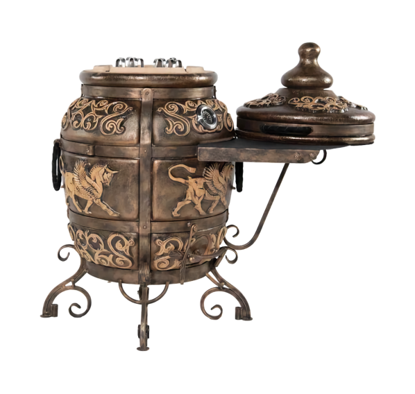 Тандыр "ЭКОтандыр-Перс-Толпар" — для требовательных, но оригинальных гурманов. Большой размер и широкая горловина сочетается с изысканной формовкой от большего к малому: в корпус тандыра помещается от двух до более закладок различных блюд, а термометр, удобно размещённый на корпусе, оперативно измерит прогрев толстых стенок. Тандыр пронизан отголосками к тюркской культуре — на его корпусе красуется глянцевый Толпар (в переводе означает "Крылатый конь"), что является его изюминкой и оригинальной чертой. Опорой тандыру служат устойчивые кованые ножки. Тандыр "ЭКОтандыр-Перс-Толпар" впишется в любой загородный дом, дачу или коттедж, согревая и обеспечивая комфорт в использовании.