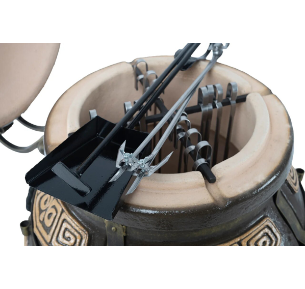 тандыр, шампуры, кочерга, совок, колосник, приспособление для подвешивания шампуров, термометр, жароотсекатель, столики - 2 шт., чехол на тандыр