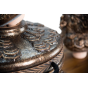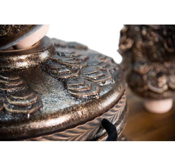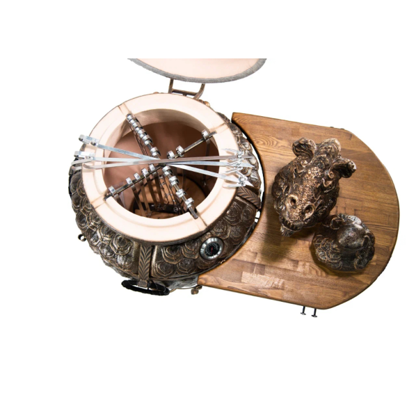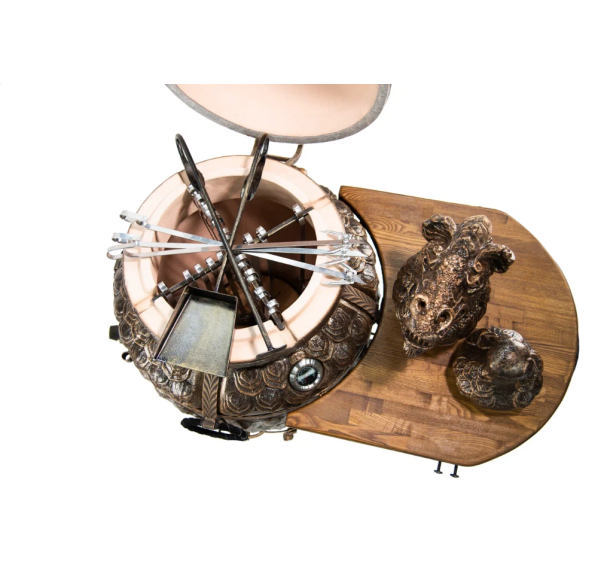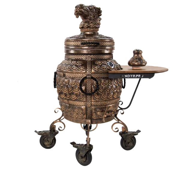 Именно с модели "ЭКОтандыр-Шёлковый-путь" началась серия эксклюзивных тандыров. Когда мы упоминаем шёлковый путь, то ассоциации неизменно приводят нас в Китай. Дракон — это символ доброго начала, символ могущественного покровителя. Корпус, крышка и колпачок словно покрыты чешуей. Образ дополняет подарочный колпачок в виде головы дракона — к каждому тандыру скульпторы создают его вручную. Сочетая разнообразные техники ручной формовки, мастера при помощи скульпторов создают уникальные изделия.