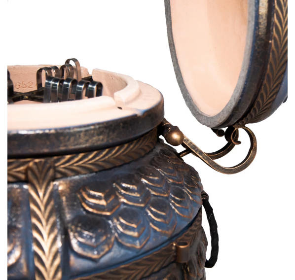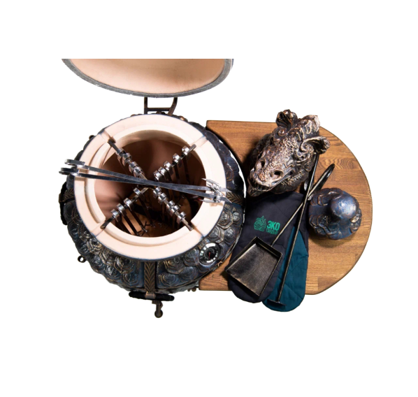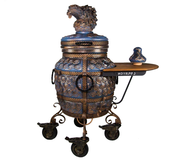 Именно с модели "ЭКОтандыр-Шёлковый-путь" началась серия эксклюзивных тандыров. Когда мы упоминаем шёлковый путь, то ассоциации неизменно приводят нас в Китай. Дракон — это символ доброго начала, символ могущественного покровителя. Корпус, крышка и колпачок словно покрыты чешуей. Образ дополняет подарочный колпачок в виде головы дракона — к каждому тандыру скульпторы создают его вручную. Сочетая разнообразные техники ручной формовки, мастера при помощи скульпторов создают уникальные изделия.