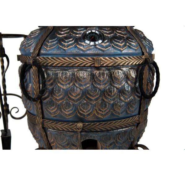 тандыр, шампуры, кочерга, совок, колосник, крестовина, термометр, жароотсекатель, столик, колёса - 4 шт., дополнительный колпачок, чехол на тандыр, рукавицы-прихватки, зольный ящик, сумка-переноска-дровница, этажерка 3-х ярусная большая
