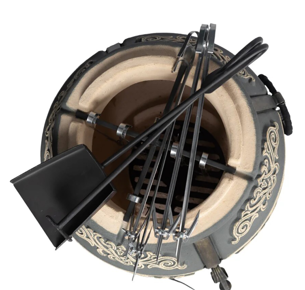 тандыр, шампуры, кочерга, совок, колосник, приспособление для подвешивания шампуров, термометр, жароотсекатель, столик, чехол на тандыр, колёса - 4 шт.