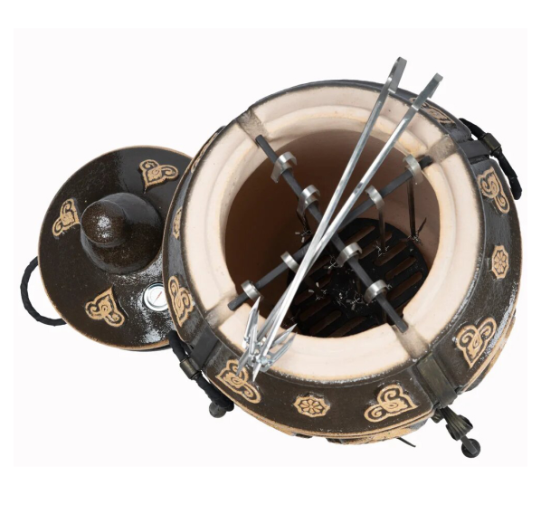 тандыр, шампуры, кочерга, совок, колосник, приспособление для подвешивания шампуров, термометр, жароотсекатель, чехол на тандыр, колёса - 4 шт.