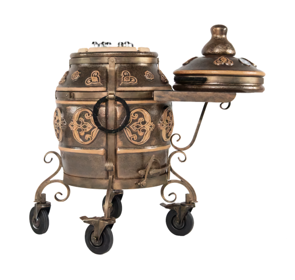 тандыр, шампуры, кочерга, совок, колосник, приспособление для подвешивания шампуров, термометр, жароотсекатель, столик, чехол на тандыр, колёса - 4 шт.