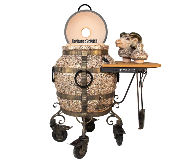 тандыр, шампуры, кочерга, совок, колосник, приспособление для подвешивания шампуров, термометр, жароотсекатель, столик, колёса - 4 шт., дополнительный колпачок, чехол на тандыр, рукавицы-прихватки
