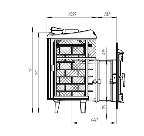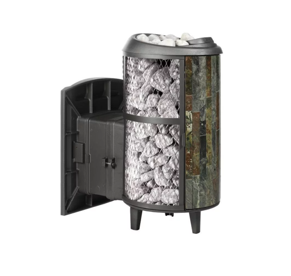Закрытая каменка сделана из нержавеющей стали 3мм, вода поступает внутрь через встроенную стальную трубку с широкой заливной горловиной. Для доступа к топке предусмотрены специальные технические отверстия, а управлять горением непосредственно из парной удобно через дверцу, которая навешивается справа или слева. Дверца защищена жаростойким стеклом от проверенного японского производителя. Цельнолитая топка с толстыми стенками вмещает дрова большого размера. Паровая пушка внутри закрытой каменки за счет высокой температуры позволяет получить высококачественный чистый пар уже через пол часа после начала топки.