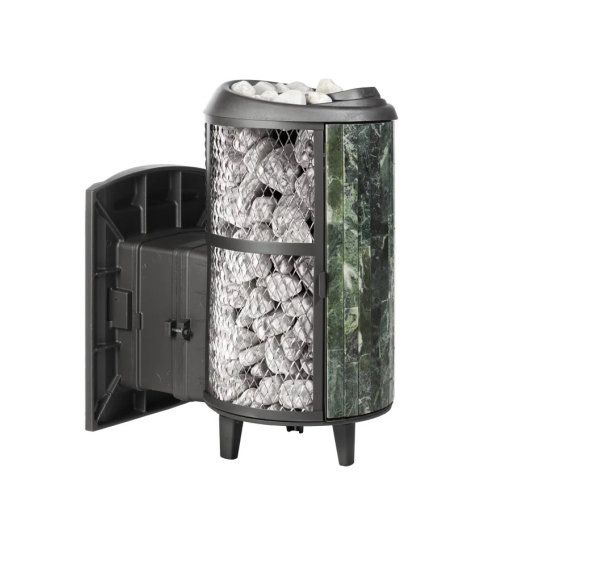 Закрытая каменка сделана из нержавеющей стали 3мм, вода поступает внутрь через встроенную стальную трубку с широкой заливной горловиной. Для доступа к топке предусмотрены специальные технические отверстия, а управлять горением непосредственно из парной удобно через дверцу, которая навешивается справа или слева. Дверца защищена жаростойким стеклом от проверенного японского производителя. Цельнолитая топка с толстыми стенками вмещает дрова большого размера. Паровая пушка внутри закрытой каменки за счет высокой температуры позволяет получить высококачественный чистый пар уже через пол часа после начала топки.