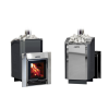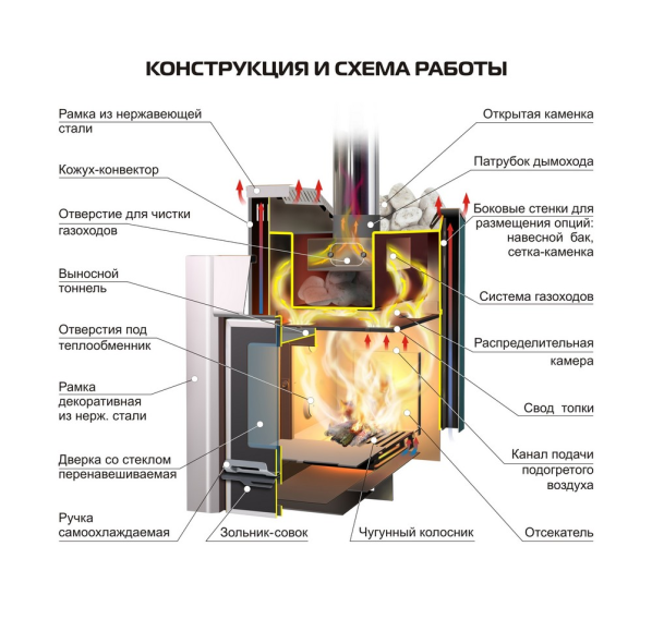 В базовой комплектации печь оборудована открытой каменкой, имеет объемную топку с выносом, вмещающую поленья длиной до 50 см и дверцу с большим панорамным стеклом и системой самоочистки.