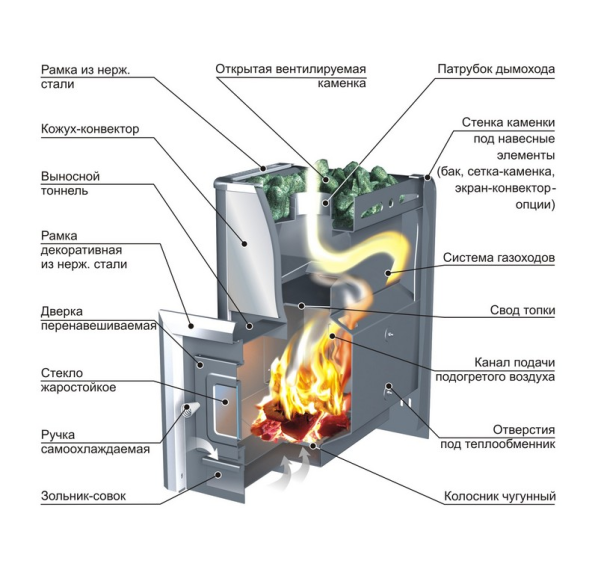 - Дополнительный экран-конвектор для защиты от жёсткого ИК-излучения задней стенки.