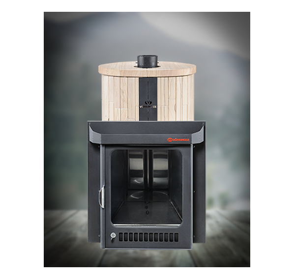 Колосниковая решетка в этой печи для бани на дровах отсутствует. Заложенные дрова разжигают сверху. Не имея над собой препятствий, огонь сразу передает тепло каменке. Пламя постепенно спускается, каждый слой дров прогорает полностью. Система Vortex создает вихревые газовые потоки, не дает пламени подниматься в дымоход. Такие инженерные решения обеспечивают печи высокий КПД, топливо расходуется экономно и эффективно.