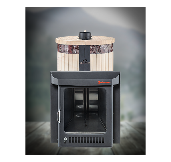 Колосниковая решетка в этой печи для бани на дровах отсутствует. Заложенные дрова разжигают сверху. Не имея над собой препятствий, огонь сразу передает тепло каменке. Пламя постепенно спускается, каждый слой дров прогорает полностью. Система Vortex создает вихревые газовые потоки, не дает пламени подниматься в дымоход. Такие инженерные решения обеспечивают печи высокий КПД, топливо расходуется экономно и эффективно.