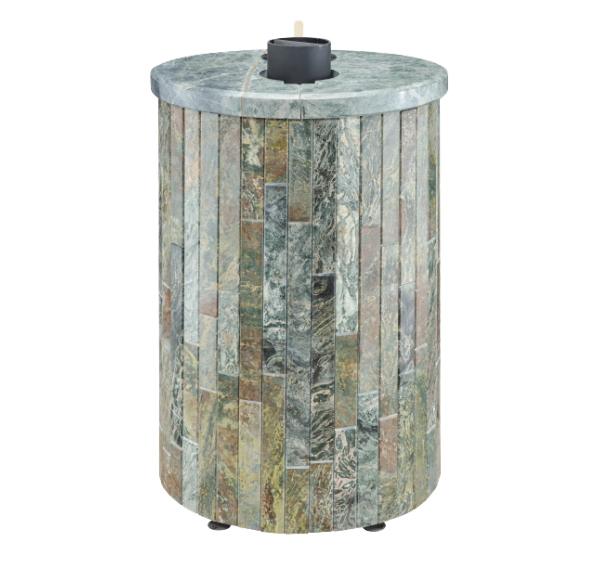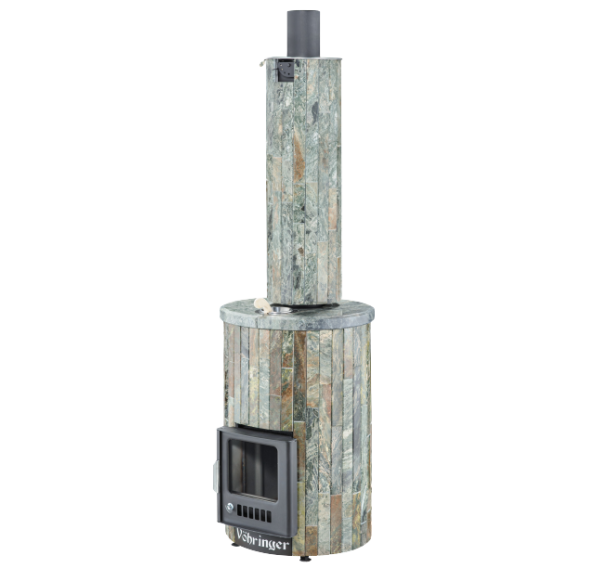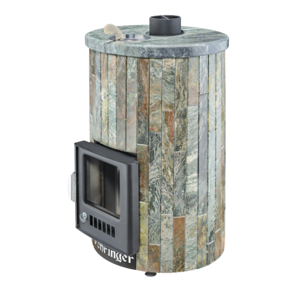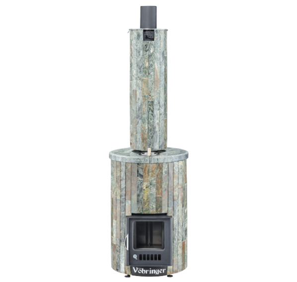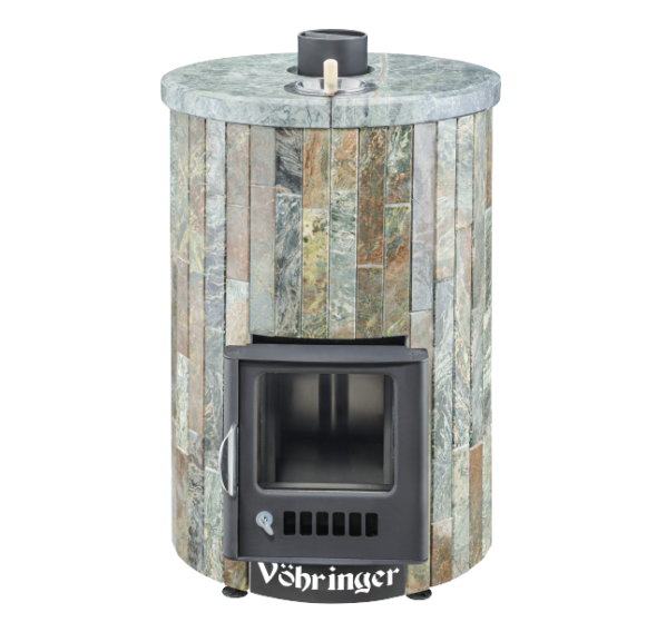 Облицовка печи – ламели из натурального камня, установленные вокруг всего корпуса. Камень блокирует распространение инфракрасного излучения, защищает парильщиков от случайного прикосновения к раскаленному металлу топки. Производство ламелей ведется по собственной запатентованной технологии завода Vöhringer.