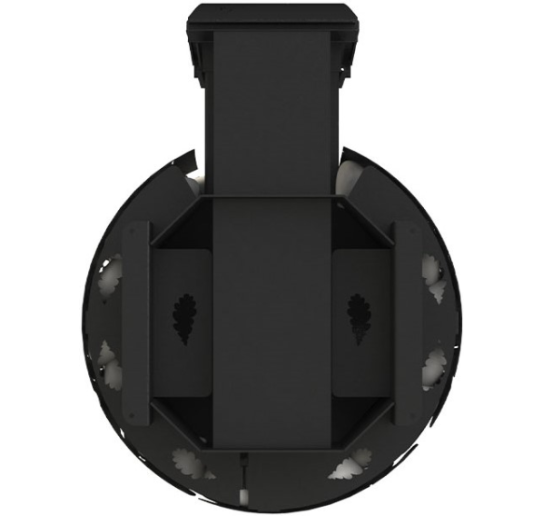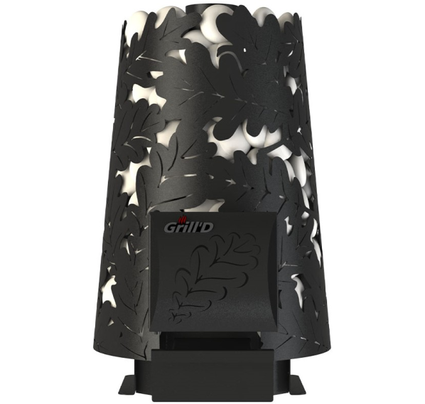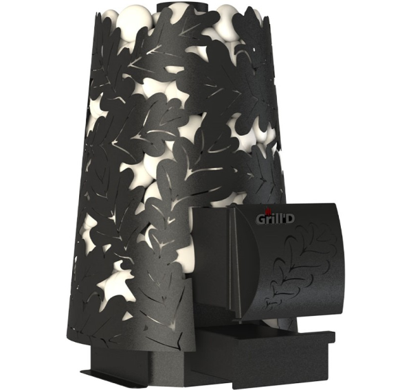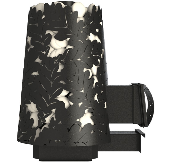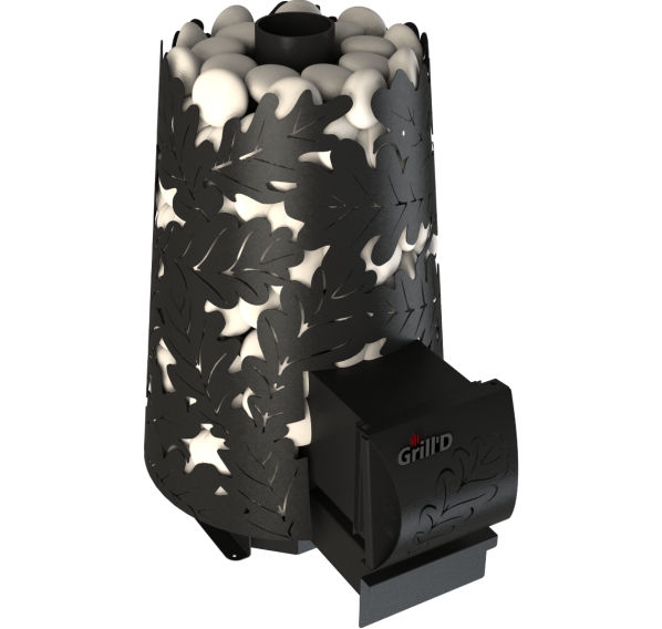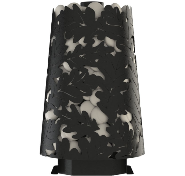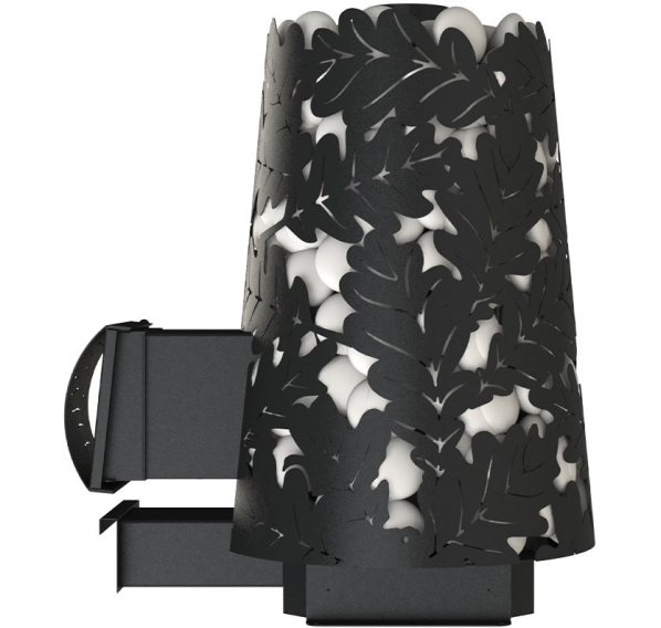 - Резной кожух с узором в виде дубовых листьев надежно удерживает большой объем камней.