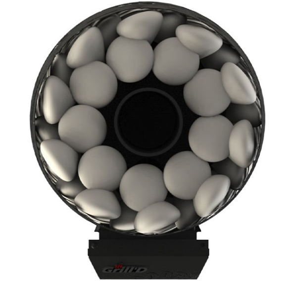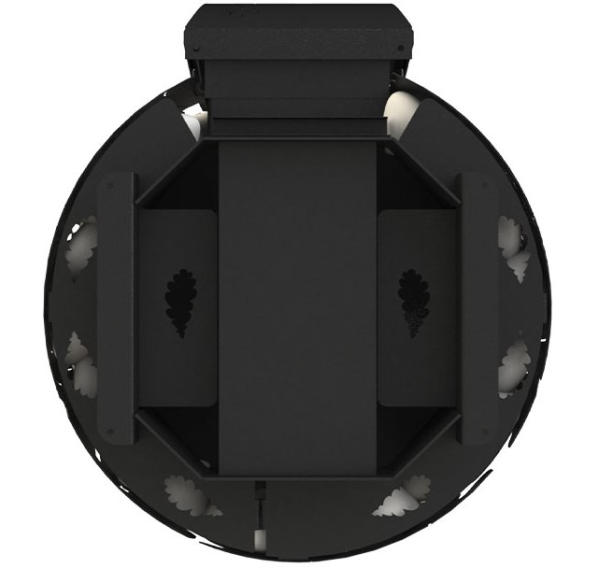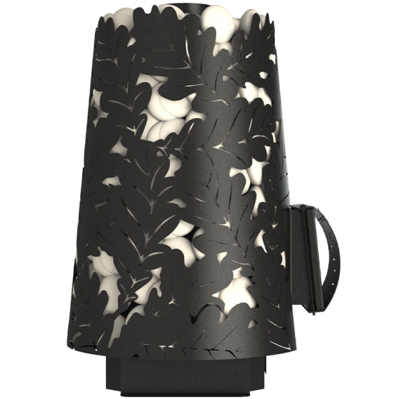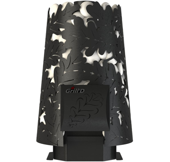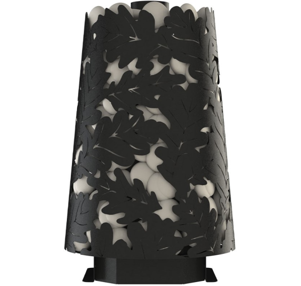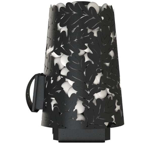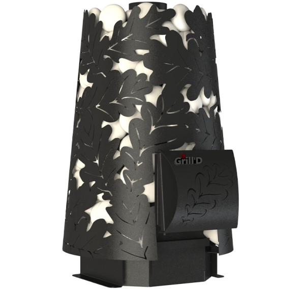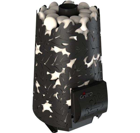- Резной кожух с узором в виде дубовых листьев надежно удерживает большой объем камней.