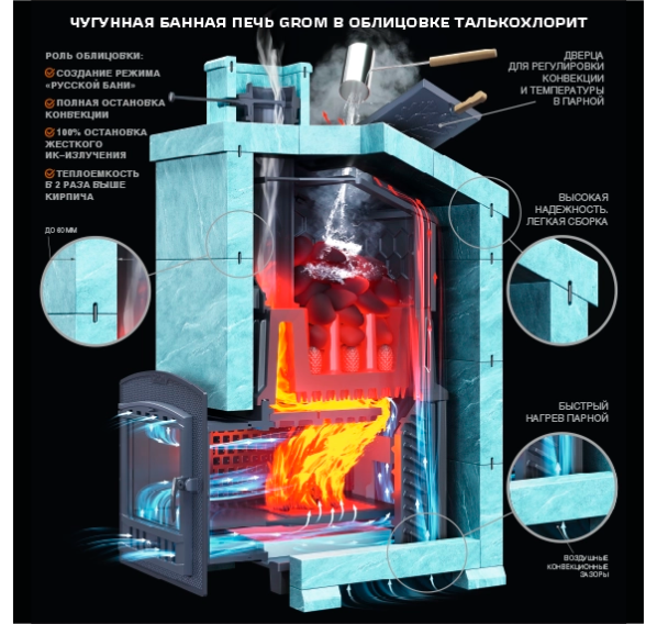 Банная печь “Гром 80 П2” под обкладку производства компании “Технолит” снабжена современной каменкой серии “Гром”, которая отличается повышенной массой и увеличенной толщиной боковых стенок. Ребра конвекции, которые расположены как с внешней, так и с внутренней стороны каменки, увеличивают скорость нагрева воздуха в парной. Каменка “Гром” относится к премиальному оборудованию, характеризуется повышенной прочностью и долговечностью, нагревается в два раза быстрее, чем другие модели и способна долгое время сохранять необходимую температуру.