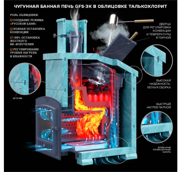 Чугунная банная печь “Гефест ЗК 25 (П2)” рассчитана на установку в помещении парной объемом до 25 куб.м. и предназначена для частого использования. Серия “GFS ЗК” имеет усиленную каменку повышенной массы, которая быстро и равномерно нагревается за счет увеличенной площади соприкосновения огня с поверхностью каменки. Важной конструктивной особенностью печи является отсутствие сварных швов и болтовых соединений, таким образом обеспечивается максимальная прочность и долговечность конструкции.