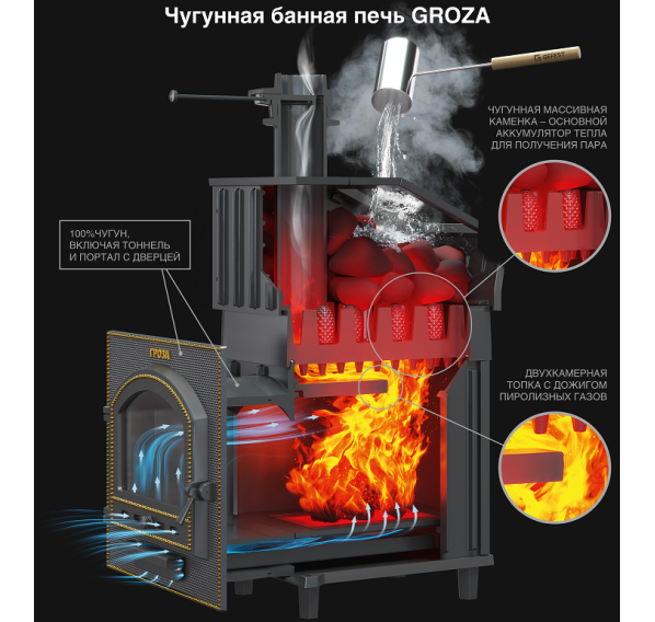 Банная печь “Гроза Ураган 18 (М)” производства российской компании “Технолит” предназначена для установки в помещении объемом до 18 м.куб. В основе печи - топка серии “Гроза”, произведенная из жаропрочного хромистого чугуна, с двумя камерами и увеличенной площадью контакта с пламенем за счет наличия специальных теплосъемных шипов. Основной конструктивной особенностью печи является отсутствие сварных швов и болтовых соединений, таким образом обеспечивается максимальная прочность и долговечность конструкции.