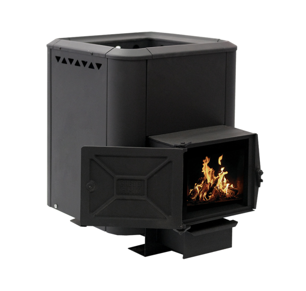 Банная печь в конвекционном кожухе компактная и подойдет для установки даже в небольшой парилке. Сэкономить полезное пространство, а заодно поддержать чистоту в парной поможет и выносная топка - при желании загружать дрова можно из соседнего помещения, дополнительно обогревая и его.