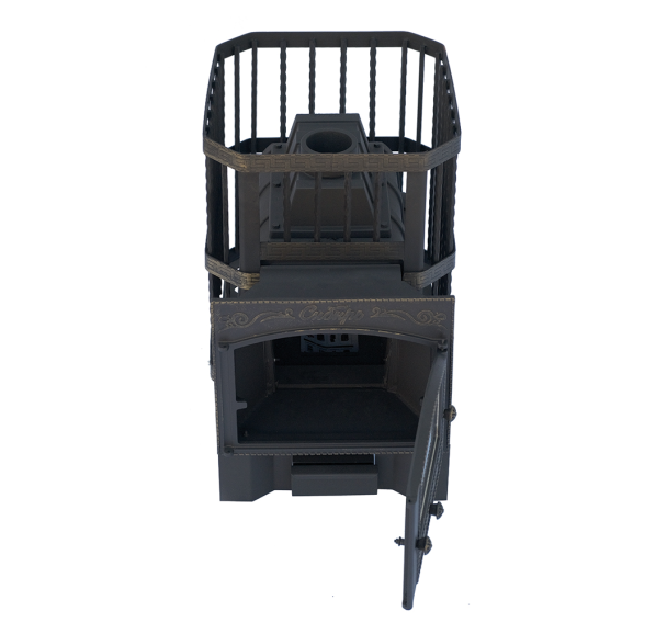 Чугунная банная печь от “НМК” очень надежна. Топка, выполненная из литых элементов, максимально герметична и способна длительное время сохранять свои рабочие характеристики. Чугунный отбойник перенаправляет поток газов и пламени в топке, способствуя повышению КПД печки. Печь топится дровами, но при необходимости в качестве дополнительного вида топлива может выступать бурый уголь. Открытая каменка вмещает до 180 кг камней, прочная сетка не деформируется и выдерживает длительную нагрузку.