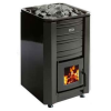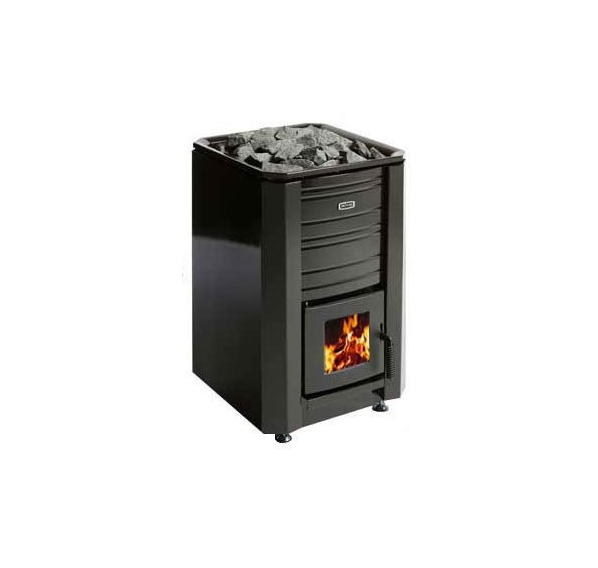 Дровяная печь-каменка черного цвета, эмалированная. Объем парилки: 10-24 м3