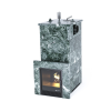 - Закрытая каменка вмещает 115 кг камней. Для быстрой и удобной ревизии в отдельных модификациях печей “Геленджик” предусмотрен боковой вход.