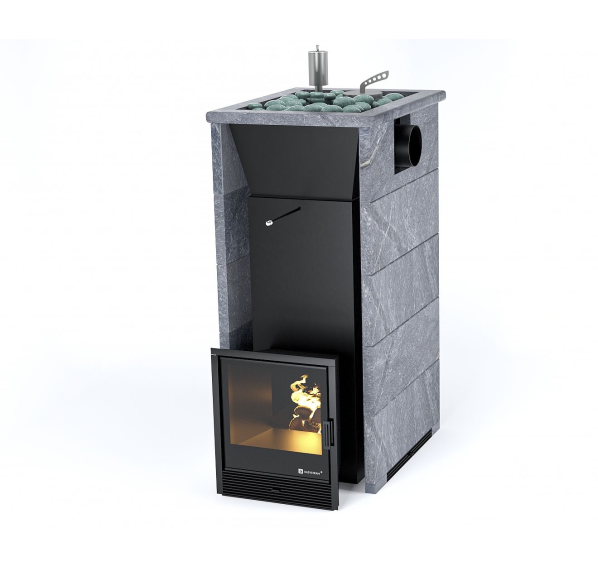 Банная печь Изистим Геленджик в трехстороннем кожухе с открытым верхом с боковым подключением Талькохлорит