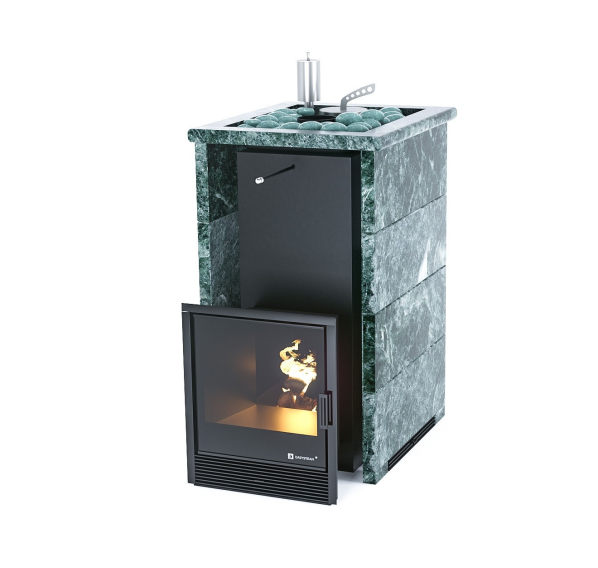 - в полноценной каменной облицовке или в трехстороннем каменном кожухе (на выбор: талькохлорит, змеевик, пироксенит, жадеит);