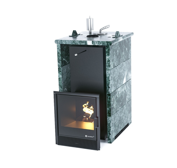 • в полноценной каменной облицовке или в трехстороннем каменном кожухе (на выбор: талькохлорит, змеевик, пироксенит, жадеит);