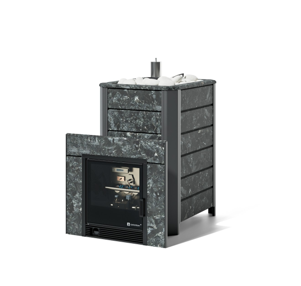 Банная печь Изистим Ялта 35/2024 в облицовке Пироксенит Газ САБК-40 вынос 300 мм
