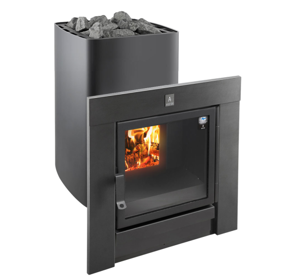 Печь для бани и сауны с выносной топкой. Рамка - нержавеющая сталь, окрашенная в чёрный цвет. Объем парилки: 25-40 м3
