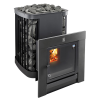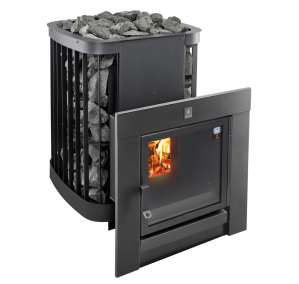 Печь для бани и сауны с выносной топкой. Рамка - нержавеющая сталь, окрашенная в чёрный цвет. Объем парилки: 15-30 м3