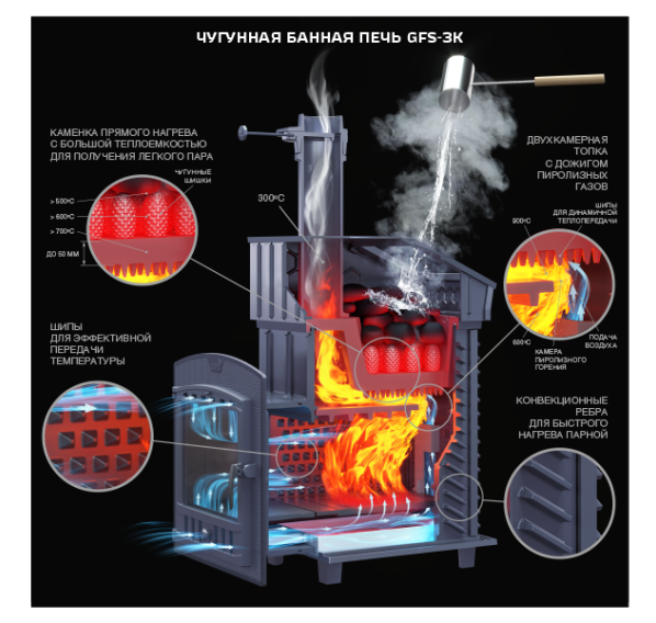 Универсальный печь-комплект на базе топки серии “GFS ЗК” дополнен специальным чугунным коробом, преобразующим открытую каменку в закрытую. Печь-комплект “Гефест GFS ЗК 30” рассчитана на установку в помещении парной объемом до 30 куб.м. и предназначена для частого использования. Серия “GFS ЗК” имеет усиленную каменку повышенной массы, которая быстро и равномерно нагревается за счет увеличенной площади соприкосновения огня с поверхностью каменки. Важной конструктивной особенностью печи является отсутствие сварных швов и болтовых соединений, таким образом обеспечивается максимальная прочность и долговечность конструкции.