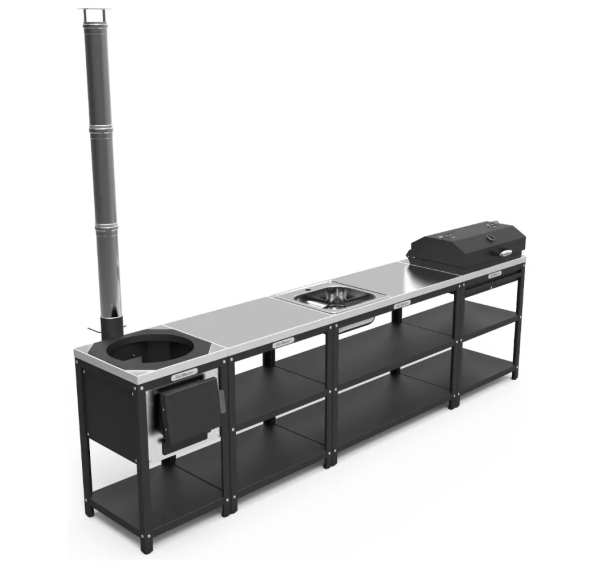 стол - 2 шт., печь, дымоход, мангал, крышка, решётка-гриль, разделочный стол - 2 шт., мойка, выпуск, сифон, крепёж