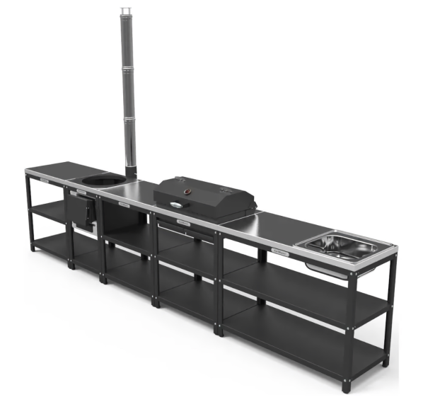 стол - 2 шт., печь, дымоход, мангал, крышка, решётка-гриль, разделочный стол - 3 шт., мойка, выпуск, сифон, крепёж