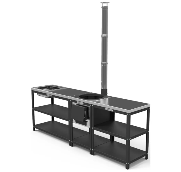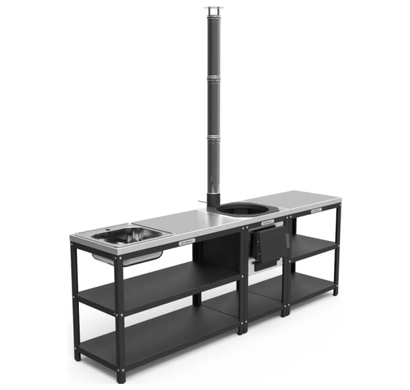 стол, печь, дымоход, разделочный стол - 2 шт., мойка, выпуск, сифон, крепёж