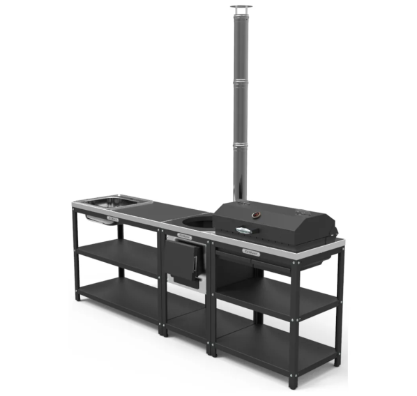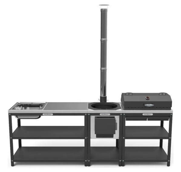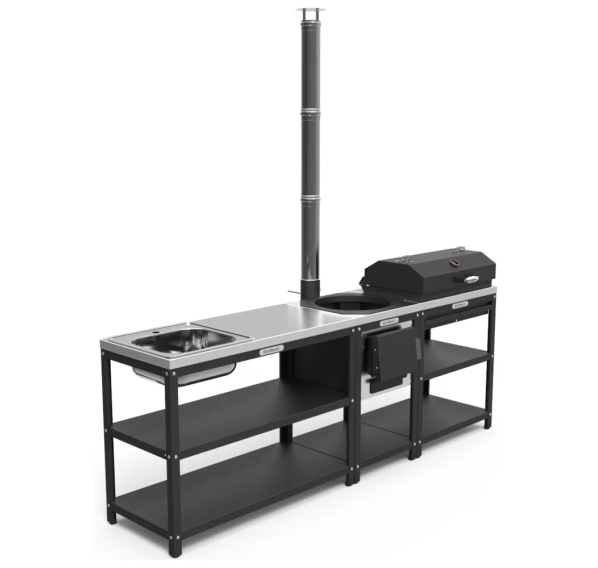 стол - 2 шт., печь, дымоход, мангал, крышка, решётка-гриль, разделочный стол, мойка, выпуск, сифон, крепёж