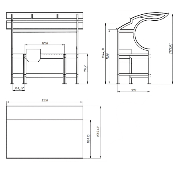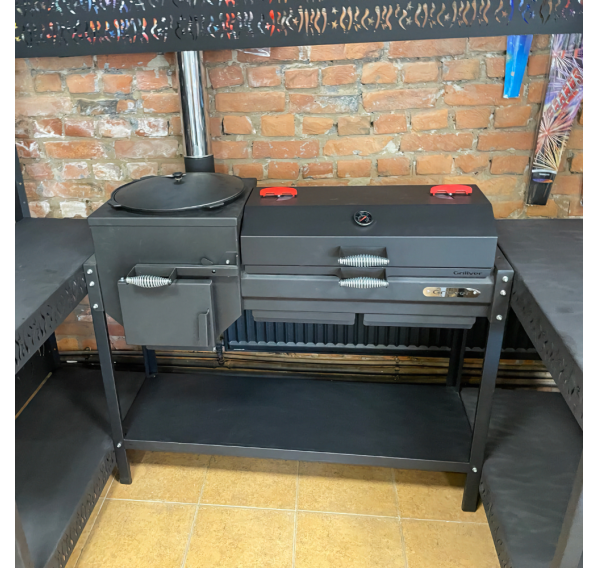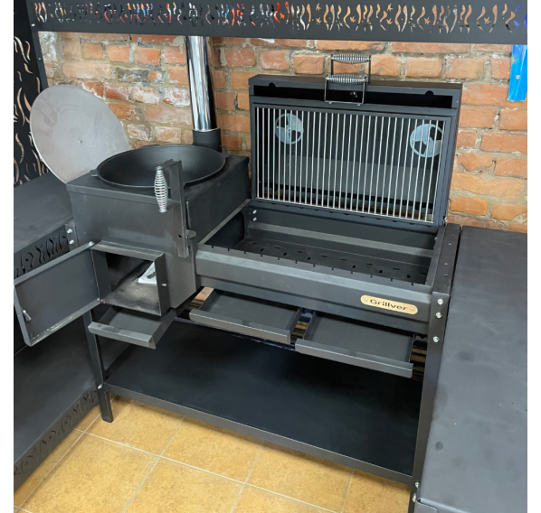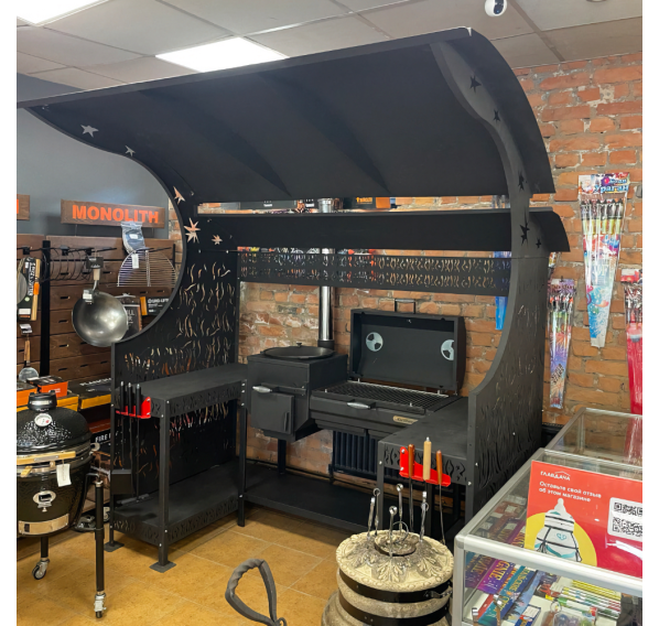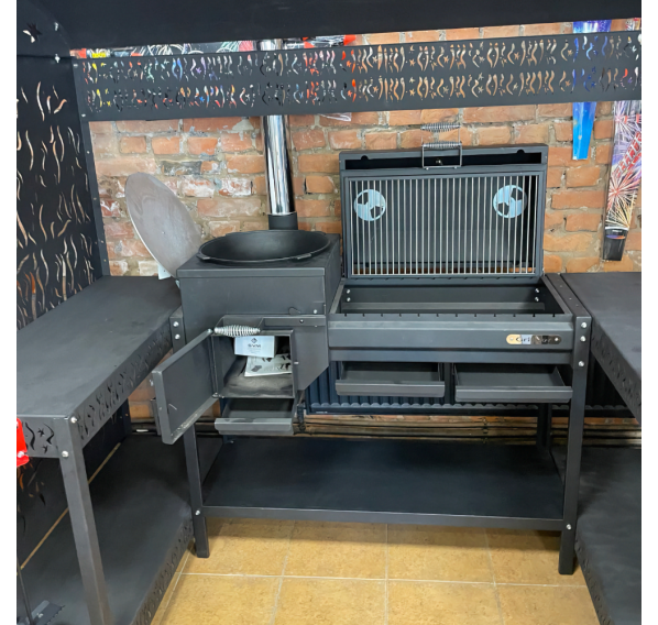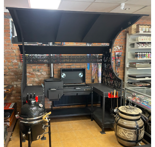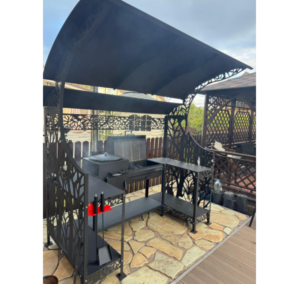 Внушительный навес комплекса защитит Вас от парящего солнца и непогоды. Два стола позволят совершать нарезку продуктов в непосредственной близости к устройству, что существенно сэкономит Ваше драгоценное время на приготовление кулинарных шедевров. На нижних полках комплекса можно хранить дрова, уголь, инструменты или посуду.