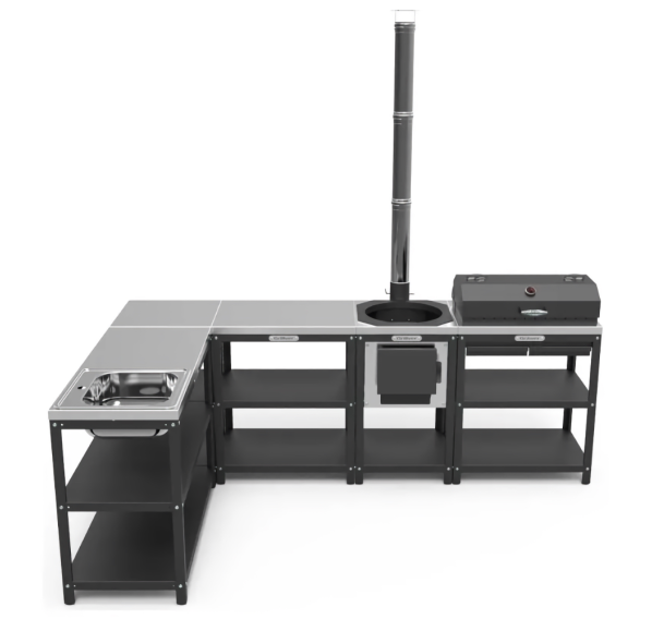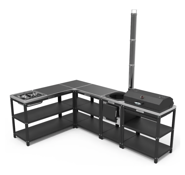 стол - 2 шт., печь, дымоход, мангал, крышка, решётка-гриль, разделочный стол - 3 шт., мойка, выпуск, сифон, крепёж